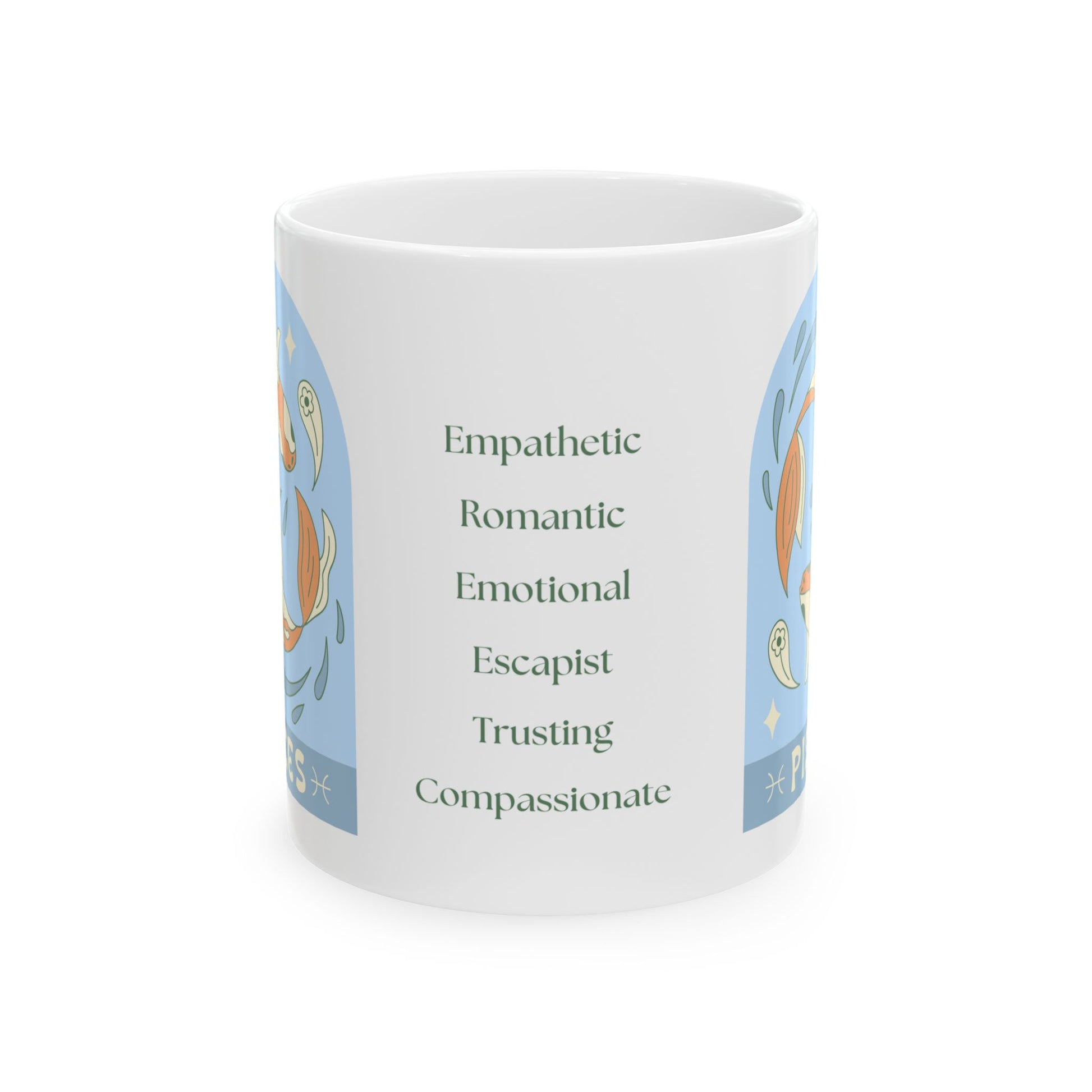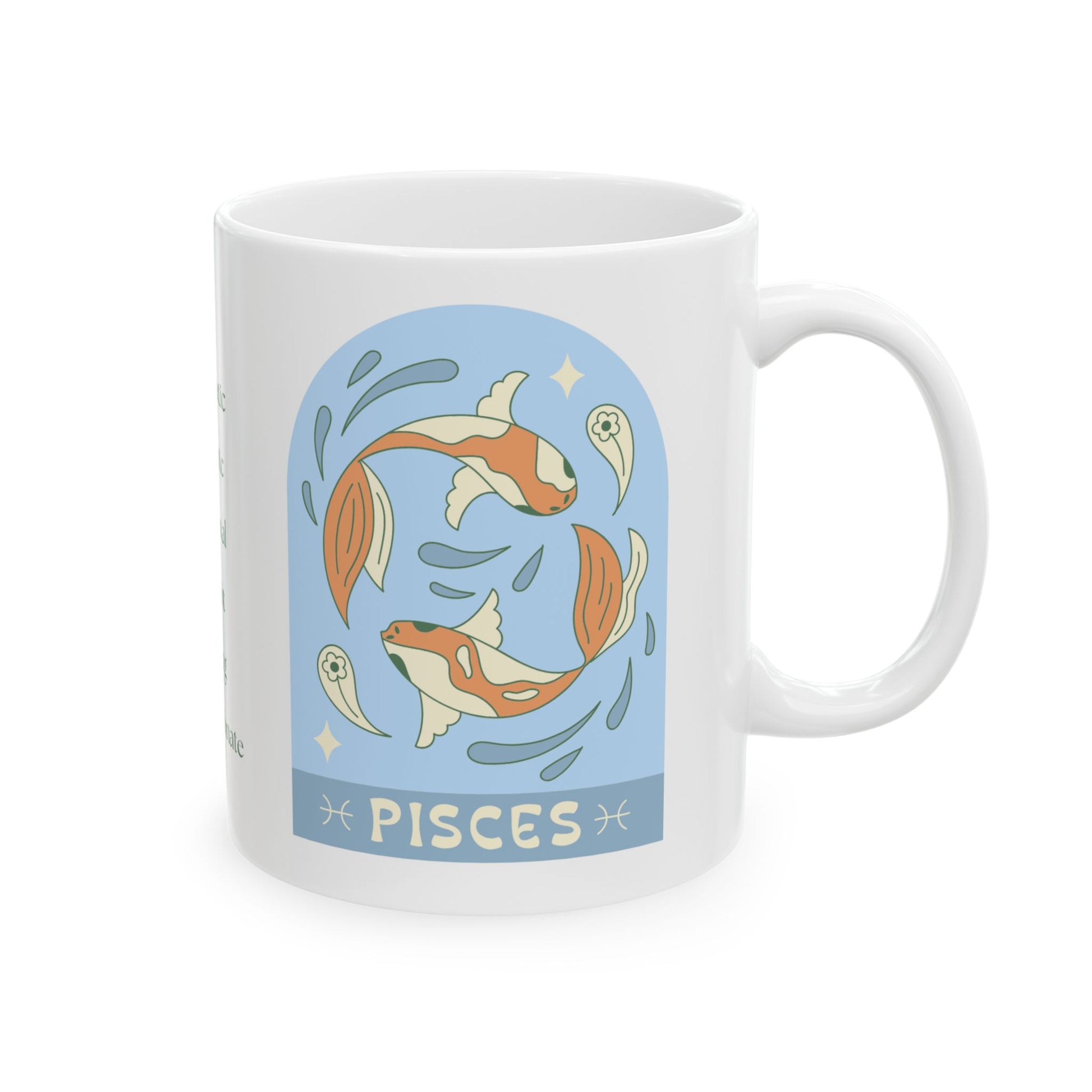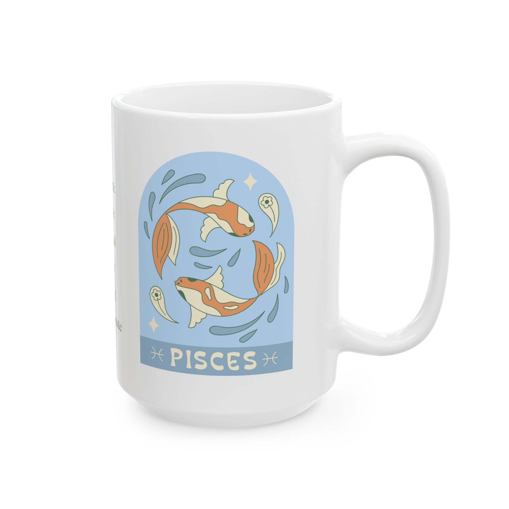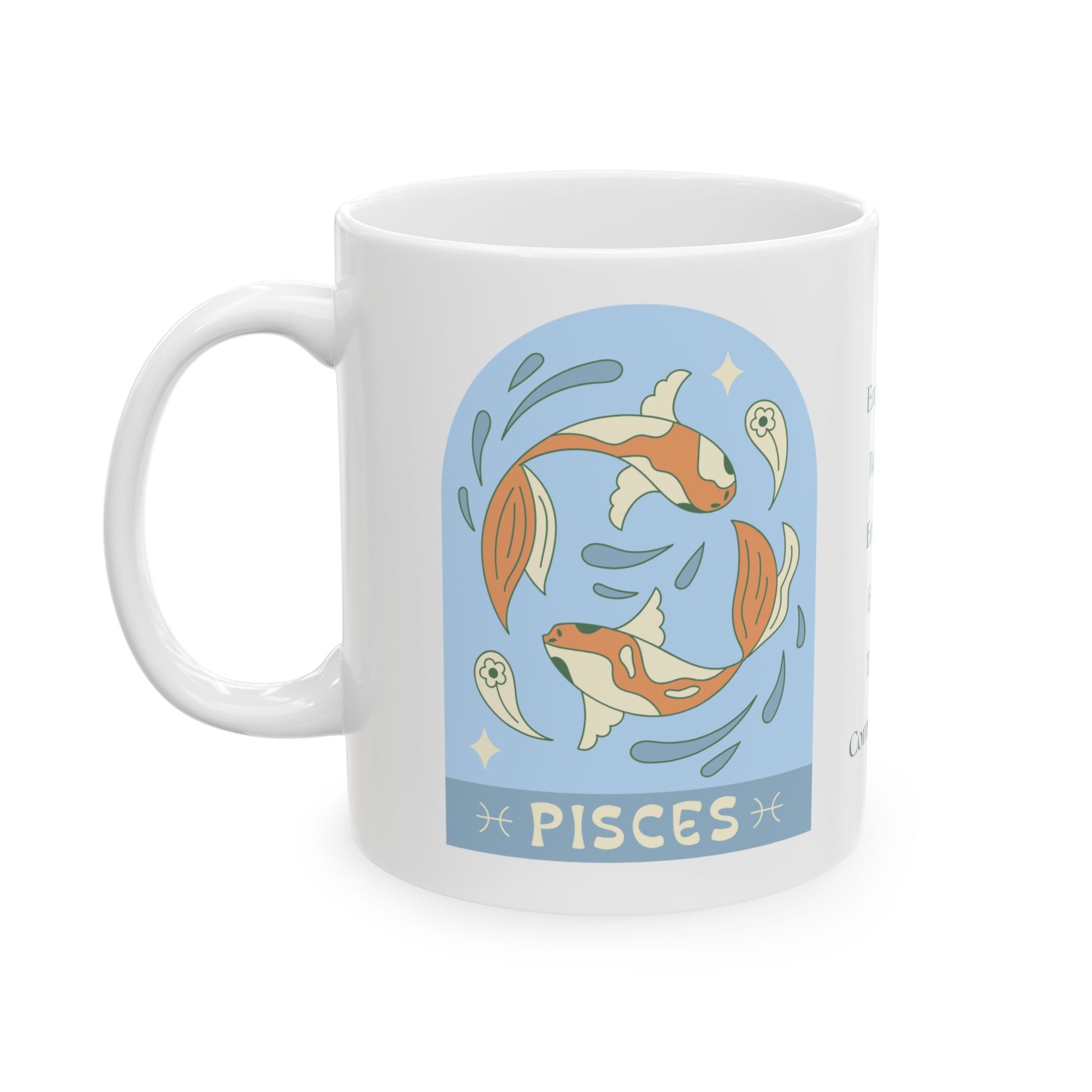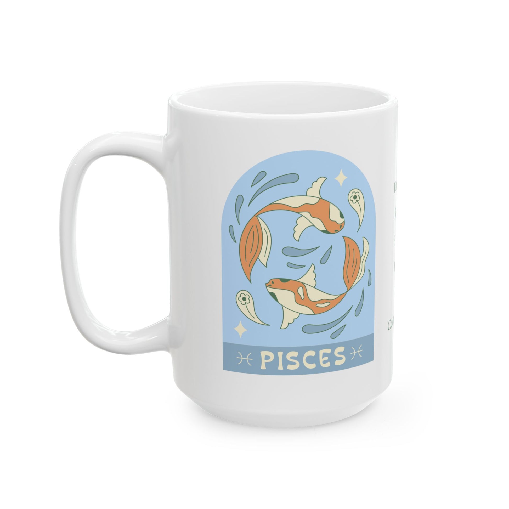 Dive into your day with this Pisces-inspired coffee mug, designed in Portland, Oregon, for those who live with one fin in reality and the other in a dream. Perfect for holding the coffee (or tea) that fuels your endless creativity, compassionate heart, and occasional need to escape the Monday blues.