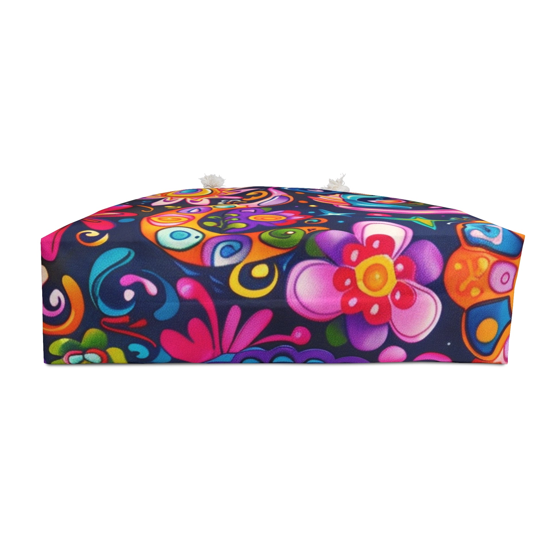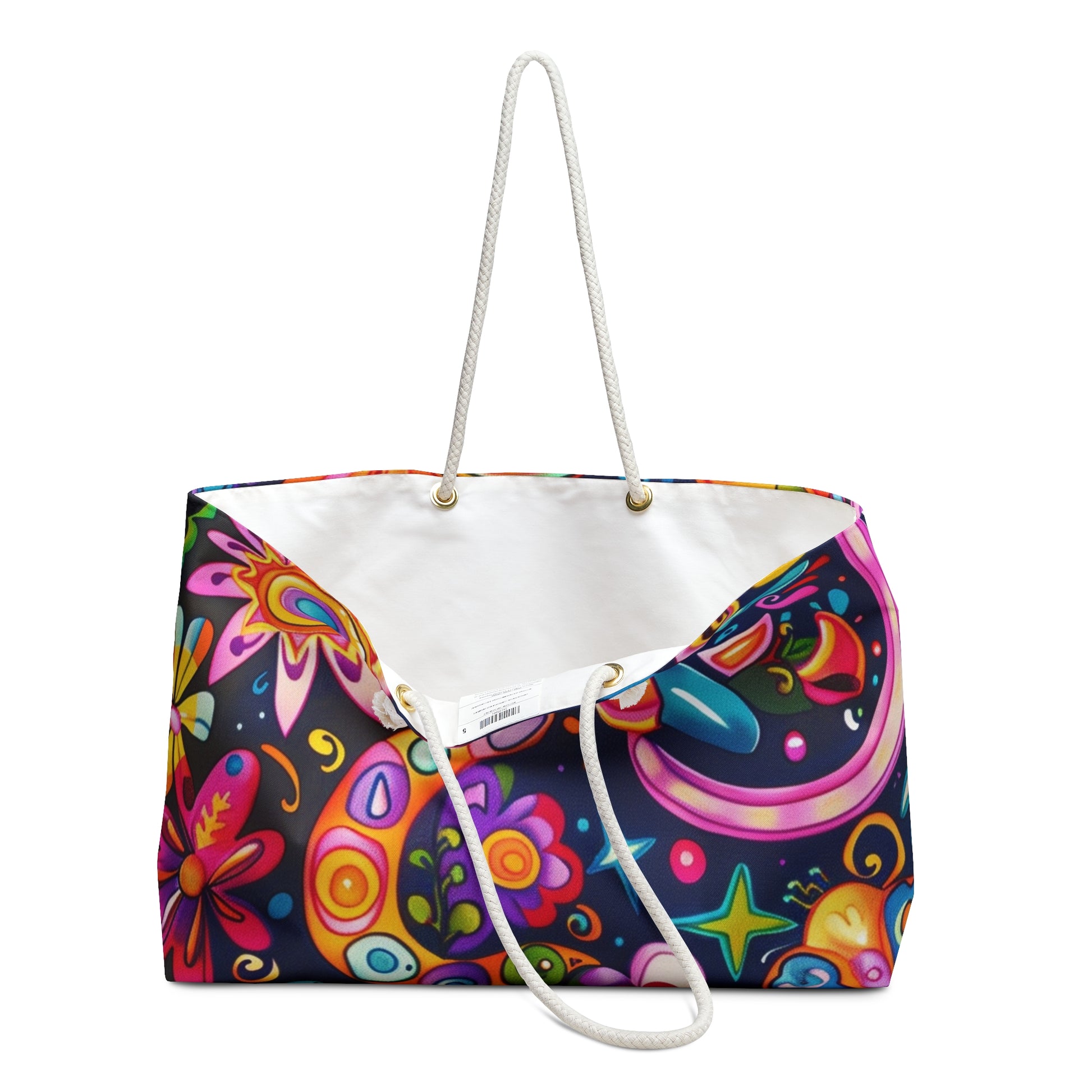 Escape the ordinary and pack your essentials in a tote as bold as your spirit. Our psychedelic weekender tote bursts with swirling colors and hypnotic patterns, radiating pure good vibes wherever you take it. Spacious enough for your weekend getaways, beach trips, or spontaneous road trips, this bag is as functional as it is eye-catching. Crafted with durable materials and sturdy rope handles, it’s designed to carry all your must-haves with ease. Whether you're chasing sunsets, dancing under the stars, or simply strolling through the city, this tote is your perfect companion for making every adventure feel a little more magical.